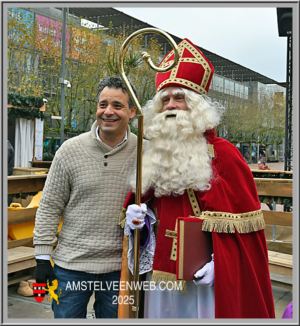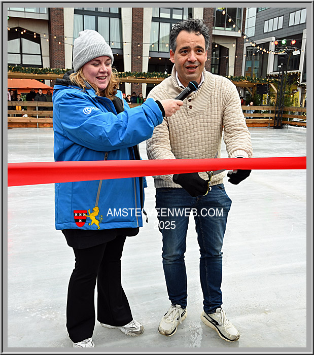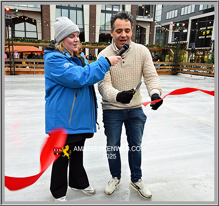 De wethouder zag er erg stoer uit met zijn wintertrui en trok ook schaatsen aan waarmee hij het ijs opging terwijl de Sint schuifelend naar hem toekwam. Elkazalai sprak de mensen toe, verwelkomde hen en vond het fijn dat de ijsschaatsbaan weer in Amstelveen was omdat dat toch wel een traditie in Amstelveen is geworden. ‘We zijn als Amstelveen’ zo zei hij ‘ongelooflijk trots dat we dit weer hebben weten te realiseren met elkaar in de kerstvakantie. Er kunnen allerlei activiteiten plaatsvinden zoals curling, maar als je wat minder mobiel bent kan je ook schaatsen in de eerste week van de kerstvakantie om het te leren of te verbeteren. Dan kunnen we in Amstelveen laten zien dat schaatsen inclusief is en dat moeten we vooral ook zo houden.’