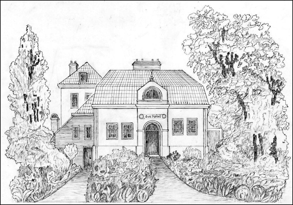 Tekening van Huis Den Heúvel, waaraan de familie haar naam te danken heeft