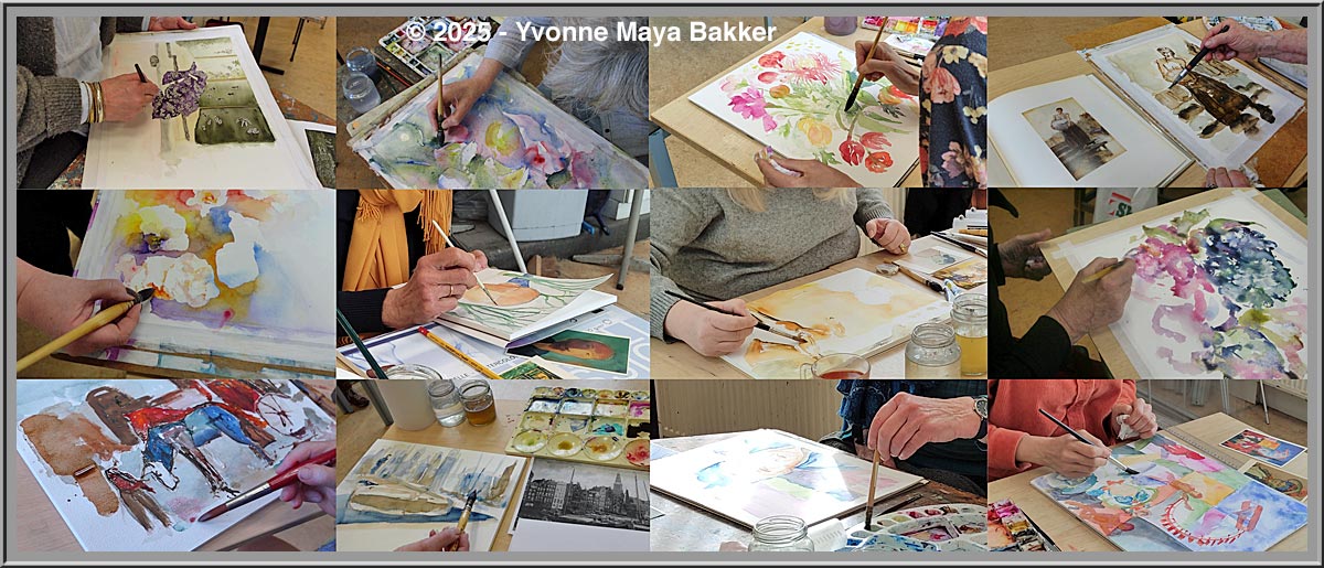 Op een donderdagochtend in september 2025 werd het om kwart voor tien stil in lokaal 1De aquarellistengroep van YvonneMaya Bakker heeft dan al koffie gedronken, bijgepraat en spullen klaargezet en was verdiept in het werk. Vanaf dat moment bevond iedereen zich een paar uur in een eigen wereld, zoekend naar kleuren, licht en donker, contrasten en vormen. Of diepte uit de herinnering een landschap of sfeer op die uiteindelijk altijd, want zo werkt aquarelverf, anders op papier komt dan je zou verwachten.